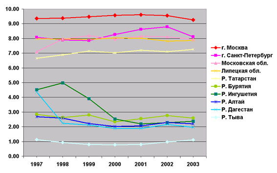 Введены показатели авто- и межрегиональной динамики интегральных категорий качества жизни, позволяющие сравнивать во времени исследуемую интегральную категорию качества жизни населения региона относительно себя самого (автодинамика) и относительно других регионов (межрегиональная динамика). Значения нтегральных индикаторов по качеству населения, уровню благосостояния и качеству социальной сферы приведены в сводной таблице .