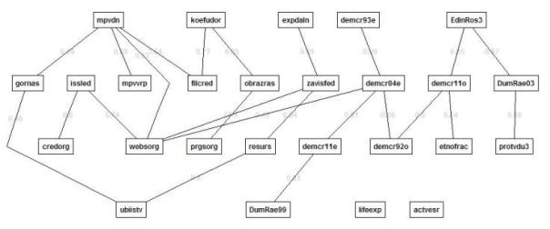 Отбор переменных. Результаты анализа показывают отсутствие связей институциональных переменных Опоры и ИЭППП (института Гайдара) со всеми остальными переменными и с отобранными нами зависимыми переменными. Мы не можем пока объяснить этот феномен для данных Опоры; что касается данных института Гайдара, это, возможно, объясняется тем, что это бинарные индексы и по своей природе они сильно отличаются от других переменных. Графические модели. Мы также использовали графические модели и методы выбора регрессионных моделей для подбора оптимального набора переменных из имеющейся базы с большим количеством переменных, отражающих схожие феномены. Основная идея: снижение размерности корреляционной матрицы, использование древообразных структур зависимостей (Chow 1970) - построение дерева максимального веса по методу Краскала на основе корреляционной матрицы, выбор ковариаций по методу Демпстера (Dempster 1972), модифицированный метод Демстера, где дерево зависимостей служит начальной точкой для применения самого метода Демпстера. Подробнее о графических моделях в анализе данных по регионам России см. [Weinberg] В качестве примера в Приложении 3 прилагается граф, использованный нами для выбора наиболее «показательного» индекса демократичности выборов. В результате анализа мы выбрали индекс демократичности на выборах 2000-2004 года по итогам экспертных оценок. Данный индекс является ключевой переменной данного множества (более трех связей) и, в частности, переменной с наибольшим количеством связей среди политико-институциональных переменных, включая прочие индексы демократичности. Комментарии к графу переменных
