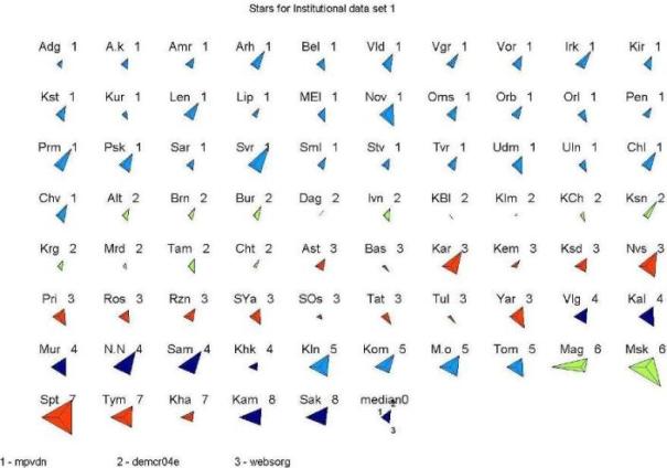 фракционализации. Другие два индекса демократичности построены в рамках проекта «Социальный атлас регионов» (см. [Атлас регионов]) сотрудниками Московского Центра Карнеги Н.В. Петровым и А.С. Титковым. Индекс демократичности DEMOCR39EZ получен суммированием экспертных оценок по 10 категориям: открытость, демократичность выборов, политический плюрализм, независимые СМИ, экономическая либерализация, гражданское общество, политическое устройство, элиты, коррупция, местное самоуправление. Лучшему региону соответствует наибольшее значение индекса. Третий индекс – индекс демократичности выборов в период с 1999 по 2002г. DEMOCR29OZ построен усреднением 11 частных индексов, основанных на следующих (объективных) данных: