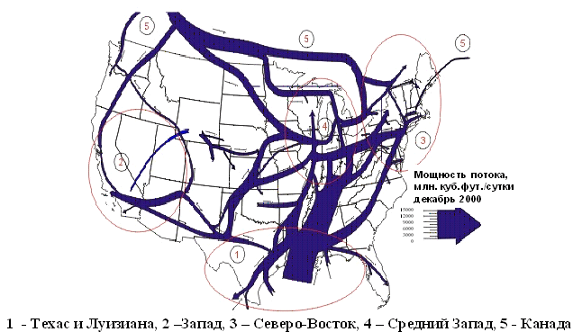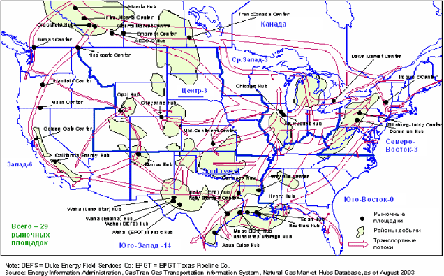 Источник: www.eia.doe.org Таким образом, в США не только создана институциональная среда для конкурентного рынка природного газа, но имеются объективные условия для его формирования: - Внутренние источники довольно равномерно распределены по территории, что, во-первых, давало возможность транспортировать природный газ по газопроводам до потребителей на относительно небольшие расстояния, во-вторых, было барьером для образования монополии по добыче природного газа, и, в-третьих, позволяло многим регионам получать практический опыт институционального развития газовой отрасли. - На рынке действует большое число добывающих компаний (около 8000). - Вдоль северной и южной границ имеются источники природного газа, связанные с потребителями, расположенными внутри страны. - На восточной и западной границах США расположены морские терминалы по приему СПГ, хотя пока их число невелико. - Морские терминалы, через которые импортируется сжиженный природный газ (СПГ), расположены в зонах потребления природного газа. - По территории страны проложена плотная сеть газопроводов с большим количеством пересечений, что дает возможность потребителям получать природный газ из различных источников. - Газопроводы принадлежат различным собственникам. К 2003 году на территории США функционировало 29 рыночных площадок по продаже природного газа по свободным ценам. Их положение на территории США показано на рис. 2. Рисунок 2. Расположение рыночных площадок природного газа в США.