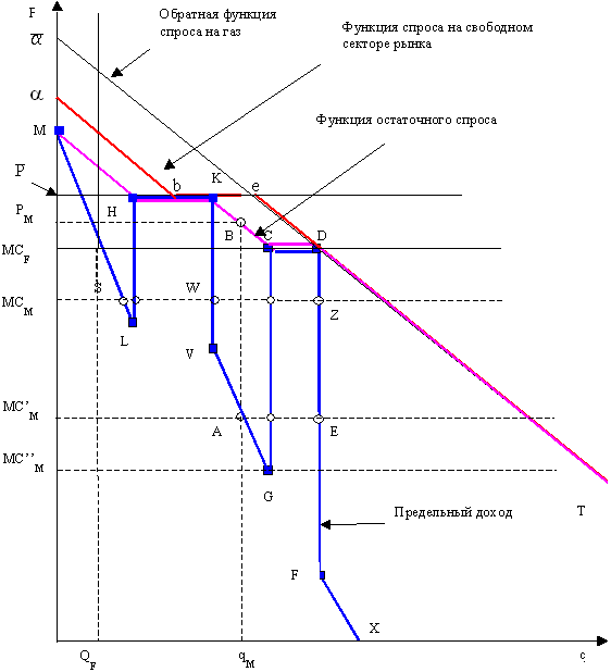 Тогда предельный доход Газпрома будет соответствовать линии MLHKVGCDFX (рис. 13). При этом возможно существование трех устойчивых равновесных состояния свободного рынка газа – S, W, Z.