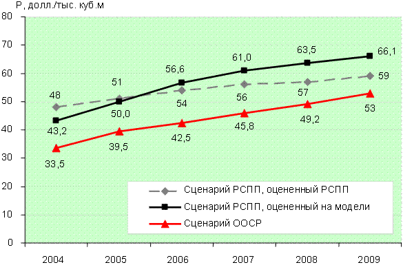 В работе анализируются два сценария развития двухсекторного рынка газа. В первом сценарии динамика роста доли свободного сектора принята по работе (РСПП, 2003) (см. рис. 7) в соответствии с прогнозом РСПП (этот сценарий далее назван сценарием РСПП). В соответствии со сценарием РСПП доля сектора свободной торговли природным газом в двухсекторном рынке природного газа должна вырасти с 33 % в 2004 году до 81 % в 2010 году. Эта динамика развития масштаба свободного рынка природного газа была использована для расчета цен газа на свободном рынке с помощью модели, предложенной в данной работе. Полученная динамика цен газа на свободном рынке была сопоставлена с той динамикой цен, которая была получена РСПП на модели, описание которой в концепции РСПП не приводится. Во втором сценарии (далее общественно оптимальный сценарий рынка, сокращенно ООСР) доля свободного сектора не задается экзогенно, как в сценарии РСПП, а определяется исходя из максимизации общественного благосостояния на основе описанной выше модели двухсекторного рынка газа. Результаты расчетов цены газа на свободном рынке для этих сценариев представлены на рис. 15. Обращает на себя внимание то, что цены природного газа на свободном рынке, предсказанные РСПП, существенно ниже тех цен, которые формируются при максимизации общественного благосостояния. В 2009 году, согласно приведенным на рис. 15 результатам, общественно оптимальные цены газа на свободном рынке будут на 12 % выше оценок РСПП. Таким образом, реальные цены природного газа при тех масштабах свободного рынка, которые были предложены в концепции РСПП, будут существенно выше прогнозируемых РСПП, что увеличивает финансовую нагрузку на потребителей природного газа. Рисунок 15. Сравнение динамики цены в свободном секторе при различных сценариях увеличения свободного газового рынка в России.
