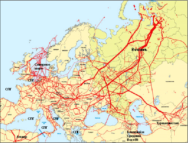 Объективные предпосылки для создания конкурентного рынка природного газа имеются и в Европе, что иллюстрирует рис. 3. Правда, в отличие от США в Европе практически нет месторождений природного газа, расположенных на суше. Однако имеется множество внешних источников природного газа. Кроме того, создана разветвленная и плотная сеть газопроводов. Рисунок 3. Система газопроводов в Европе.