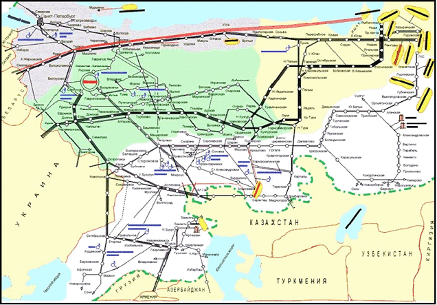 Потребители природного газа в Европе могут получать его (как по газопроводам, так и в виде СПГ через морские порты) из различных источников: Северного моря, Алжира, России, Ближнего и Среднего Востока, Туркменистана и других стран. Таким образом, и в Европе, в основном, существуют те объективные условия, которые были перечислены выше, когда речь шла о рынке газа в США, и которые являются необходимыми для создания конкурентного рынка природного газа. Однако число независимых поставщиков природного газа в Европе существенно меньше, чем в США. Следует отметить, что такой крупный поставщик природного газа в Европу, как Россия, обеспечивающая около 25 % всего потребляемого газа, имеет значительную рыночную власть. Темпы развития конкурентного рынка природного газа в Европе несколько отстают от США. Это в значительной мере объясняется необходимостью согласования законодательства европейских стран. По существу, только с созданием Европейского Союза стала возможной организация единого европейского рынка природного газа, что, в частности, выразилось в принятии Директивы Европейского Союза по газу. Является ли либерализация рынка природного газа перспективной для России? Существуют ли сегодня для этого необходимые объективные условия? Расположение газовых месторождений по территории России, их удаленность от основных потребителей природного газа, плотность газопроводов отличаются от соответствующих показателей и в США, и в Европе (см. рис. 4). Рисунок 4. Система магистральных газопроводов на территории России.