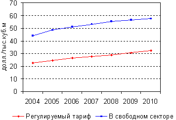 Рассчитано по данным (Макаров, Малахов, 2005) Согласно этим оценкам цена природного газа на рынке за 10 лет, т.е. к моменту полномасштабного функционирования свободного рынка газа, увеличится в три раза. Другой существенный результат, полученный в указанной работе, - превышение цен природного газа на свободном рынке по сравнению с тарифом. Такие прогнозные оценки, разумеется, формируют у ОАО «Газпром» позитивное отношение к конкурентному рынку, поскольку цены на нем ожидаются более высокими по сравнению с ожиданиями относительно тарифов на природный газ. Таким образом, можно говорить о том, что работы (РСПП, 2003) и (Макаров, Мала-хов, 2005) - источники весьма позитивных ожиданий ОАО «Газпром» в отношении увеличения своих доходов в случае организации и дальнейшего роста сектора свободной торговли природным газом. Оценки некоторых других авторов не столь оптимистичны для ОАО «Газпром» в отношении роста его доходов, однако большинство согласно с тем, что в любом случае цены на свободном рынке природного газа будут существенно выше тарифов (например, в работе (Петров, 2003) это превышение свободной цены над тарифом оценивается в 30-50%). Однако организация свободного рынка природного газа не обязательно должна привести к существенному превышению цен газа на свободном рынке по сравнению с регулируемой ценой. Для проверки этого утверждения были выполнены соответствующие расчеты. При этом были сделаны расчета и для условий, которые были использованы в расчетах ИНЭИ, результаты которых вошли в Концепцию РСПП. 1. Модель двухсекторного рынка природного газа Предполагается, что рынок газа будет состоять из регулируемого сектора и сектора свободной торговли. В регулируемый сектор природный газ поставляется единственным поставщиком - ОАО «Газпром» по регулируемому тарифу. В секторе свободной торговли, наряду с ОАО «Газпром», газ поставляют независимые производители.