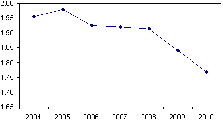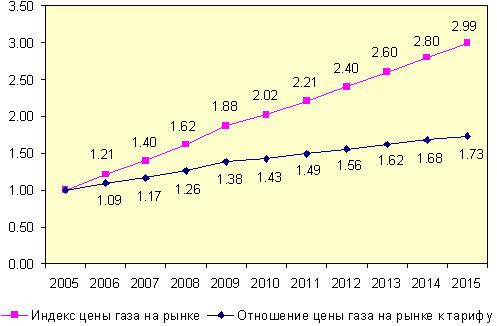 Построено по данным (РСПП, 2003) В работе (ИНЭИ, 2005) рассматривались два сценария развития либерализации рынка природного газа в России. В одном сценарии предполагалось, что свободные внутрироссийские цены газа поднимутся до уровня «конкурентных» цен за 5 лет, в другом - за 10 лет. В качестве «конкурентной» цены принималась цена природного газа на европейском рынке за вычетом экспортных пошлин и затрат на транспорт газа из России в Европу. Динамика цен газа во втором сценарии, который рассматривается авторами указанной работы как наиболее реалистичный и целесообразный, показана на рис. 8. Рисунок 8. Динамика цены природного газа на внутрироссийском рынке газа и отношение этой цены к тарифу в сценарии ИНЭИ при переходе к полномасштабному конкурентному рынку в течении 10 лет.