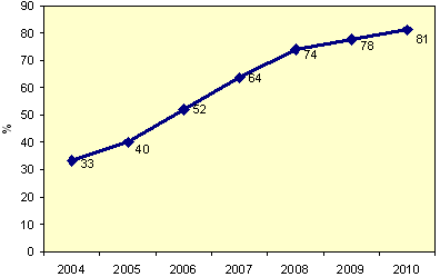Рассчитано по (РСПП, 2003) Результаты, приведенные на рис. 5 и 6, показывают, что свободная торговля природным газом весьма выгодна для производителей природного газа по сравнению с поставкой газа по регулируемым ценам. Видимо, это, по мнению авторов рассматриваемой работы, явилось существенным мотивом для задания быстрого повышения доли сектора свободной торговли в общем объеме российского рынка газа. Динамика роста этого сектора рынка показана на рис. 7. Рисунок 7. Доля свободного сектора рынка газа по Концепции РСПП.
