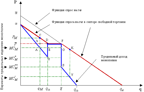 Потери общественного благосостояния в этом случае по сравнению с предыдущим случаем равны площади трапеции ACDE. Эти потери обусловлены монополией ОАО «Газпром».